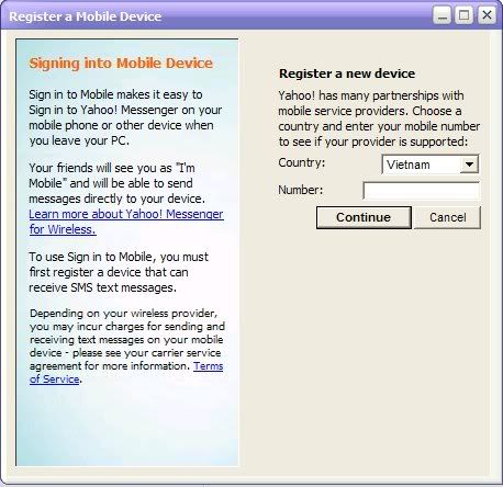 Sau khi đã điền xong , nhấp Continue. Yahoo sẽ gửi đến ĐT của bạn 4 mã số, bạn dùng 4 mã số đó nhập vào khung trống và chọn Next