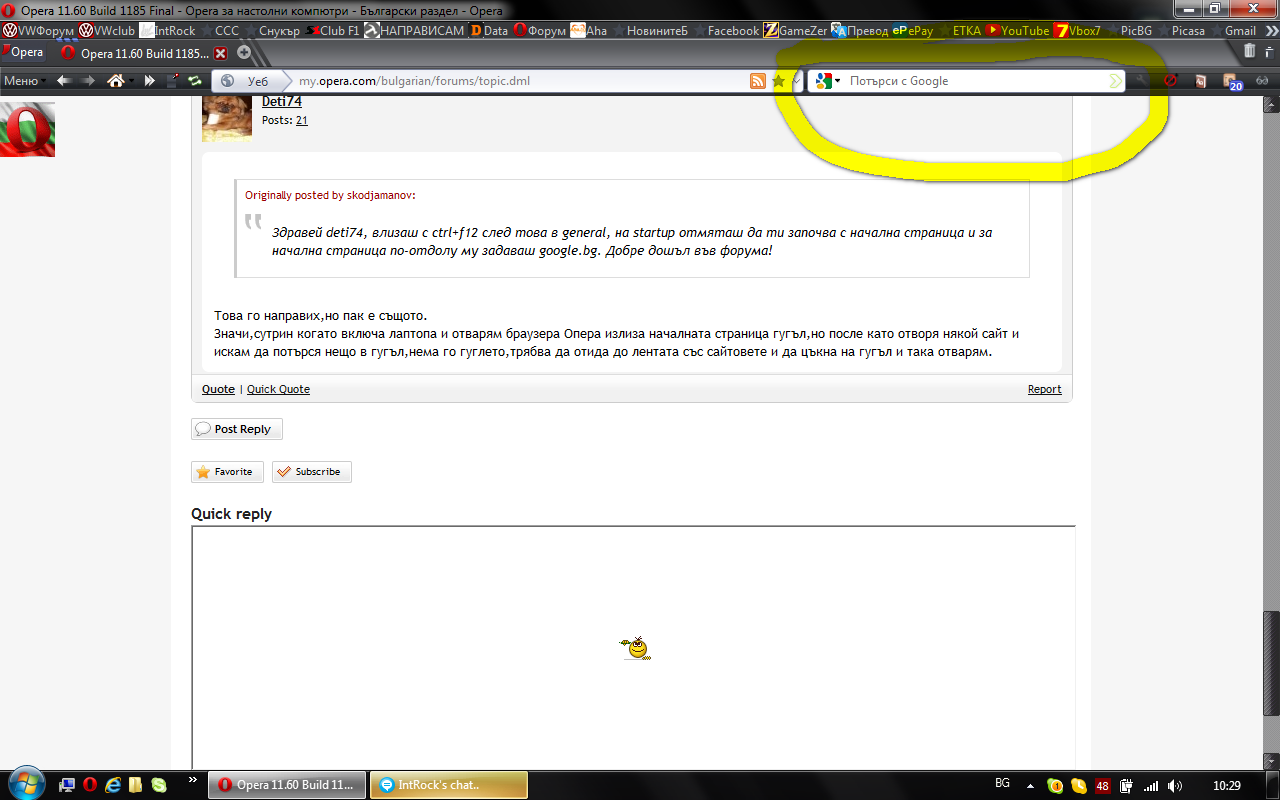 Значи,сутрин когато включа лаптопа и отварям браузера Опера излиза началната страница гугъл,но после като отворя някой сайт и искам да потърся нещо в гугъл,нема го гуглето,трябва да отида до лентата със сайтовете и да цъкна на гугъл и така отварям.