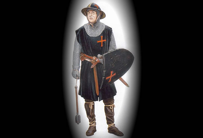 The Templars divide into several groups: the knights templar, the lower-born sergeants, the turcopoles, and the non-military brethren (craftsmen, doctors, chefs, administrators e.a.). The knights templar could only become members of the higher aristocracy. They wore a white surcoat as a sign of purity. In 1147, Pope Eugenius III granted them the right to wear a red cross as a symbol of martyrs’ blood. The red crosses were depicted not only on their surcoats, but on their shields as well. Their equipment included a chain mail, helmet, lower-leg visors, naval spear, sword, Turkish hammerhead, shield, and three knives of the same size. The lower-born seargents were templar warriors that weren’t knighted. Unlike the knights, they wore black surcoats with red cross. They wore helmets on their heads, and their shields were colored black with red cross on them. They also had arbalests. Over the two centuries of their existance, the templars developed a recognizable insignia consisting of three colors: white, black and red. The black represented religion, and was depicted at the top in their flags. The white symbolized spiritual purity, and the red cross symbolized the blood of Christ.