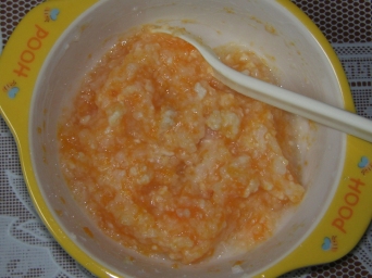 Theo sách thì đáng ra đầu giai đoạn cuối kỳ, lúc này vẫn ăn cháo 1:5 (1 gạo 5 nước), nhưng vì Mít rất thích ăn đặc, nên mẹ cháu nấu 1 gạo 3-4 nước (như cơm nát rồi). Rau xắt khúc.