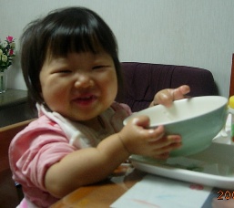 Giai đoạn Cuối kỳ9 tháng: Bây giờ thì Mít đã ăn thô giỏi lắm rồi. Có vẻ như Mít đã rất sẵn sàng để ăn cơm như của bố mẹ..Mít cực kỳ thích ăn cơm người lớn. Bố tham hay cho cả thìa cơm mà Mít cũng ăn vèo cái hết. (cơm gạo Nhật mềm và dẻo mà). Lại rất thích thức ăn của bố mẹ. Bữa cơm của cả nhà là Mít phải lượn 1 vòng bằng hết các món thì thôi. hehe...không có món gì thoát khỏi hai hàm ...lợi của Mít ... hehe ... đến thời điểm này Mít mới nhú được 1 chiếc răng khoảng 1 mm, 1 chiếc có vẻ đang chọc lợi lên. Với vốn "công cụ lao động" ít ỏi thế mà Mít đã cắn được từng miếng bánh vỡ ròn tan, cắn chuối từ quả chuối bố cầm, cắn dâu tây ... còn miếng thì xắt to cỡ đầu ngón tay là vô tư rồi.