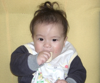 9 tháng: Bây giờ thì Mít đã ăn thô giỏi lắm rồi. Có vẻ như Mít đã rất sẵn sàng để ăn cơm như của bố mẹ..Mít cực kỳ thích ăn cơm người lớn. Bố tham hay cho cả thìa cơm mà Mít cũng ăn vèo cái hết. (cơm gạo Nhật mềm và dẻo mà). Lại rất thích thức ăn của bố mẹ. Bữa cơm của cả nhà là Mít phải lượn 1 vòng bằng hết các món thì thôi. hehe...không có món gì thoát khỏi hai hàm ...lợi của Mít ... hehe ... đến thời điểm này Mít mới nhú được 1 chiếc răng khoảng 1 mm, 1 chiếc có vẻ đang chọc lợi lên. Với vốn "công cụ lao động" ít ỏi thế mà Mít đã cắn được từng miếng bánh vỡ ròn tan, cắn chuối từ quả chuối bố cầm, cắn dâu tây ... còn miếng thì xắt to cỡ đầu ngón tay là vô tư rồi.