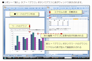 (1)リボン→「挿入」タブ→「グラフ」ボタンでワードのグラフとエクセルの表の画面が並んでウィンドウ表示されます。グラフと表のひな形が表示され、エクセルの表の編集の変更内容がワードのグラフに反映されます。↓