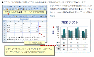 グラフのデータ範囲の大きさを変更するには、表の選択範囲(青枠内)の右下隅の■部分をドラグします。表の選択範囲の変更はグラフに反映されます。↓