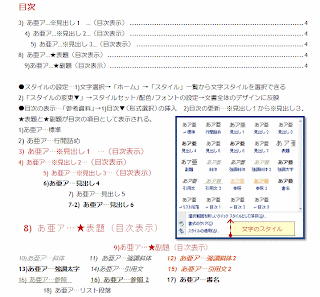 1)文字列選択→「ホーム」→「スタイル」一覧から文字スタイルを選択できます。↓