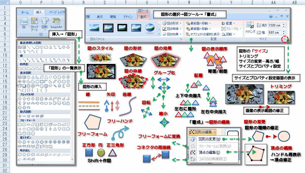 1)エクセルの作図機能を上手に利用すれば、いろいろな画像の作成が可能です。私のブログの画像の多くは、エクセルを利用しています。【画面キャプチャー】や【PrintScreen】キーで得た画像をエクセルに、ファイルから画像を【挿入】してエクセル文書に貼り付けて、図形描画で説明を加えています。↓